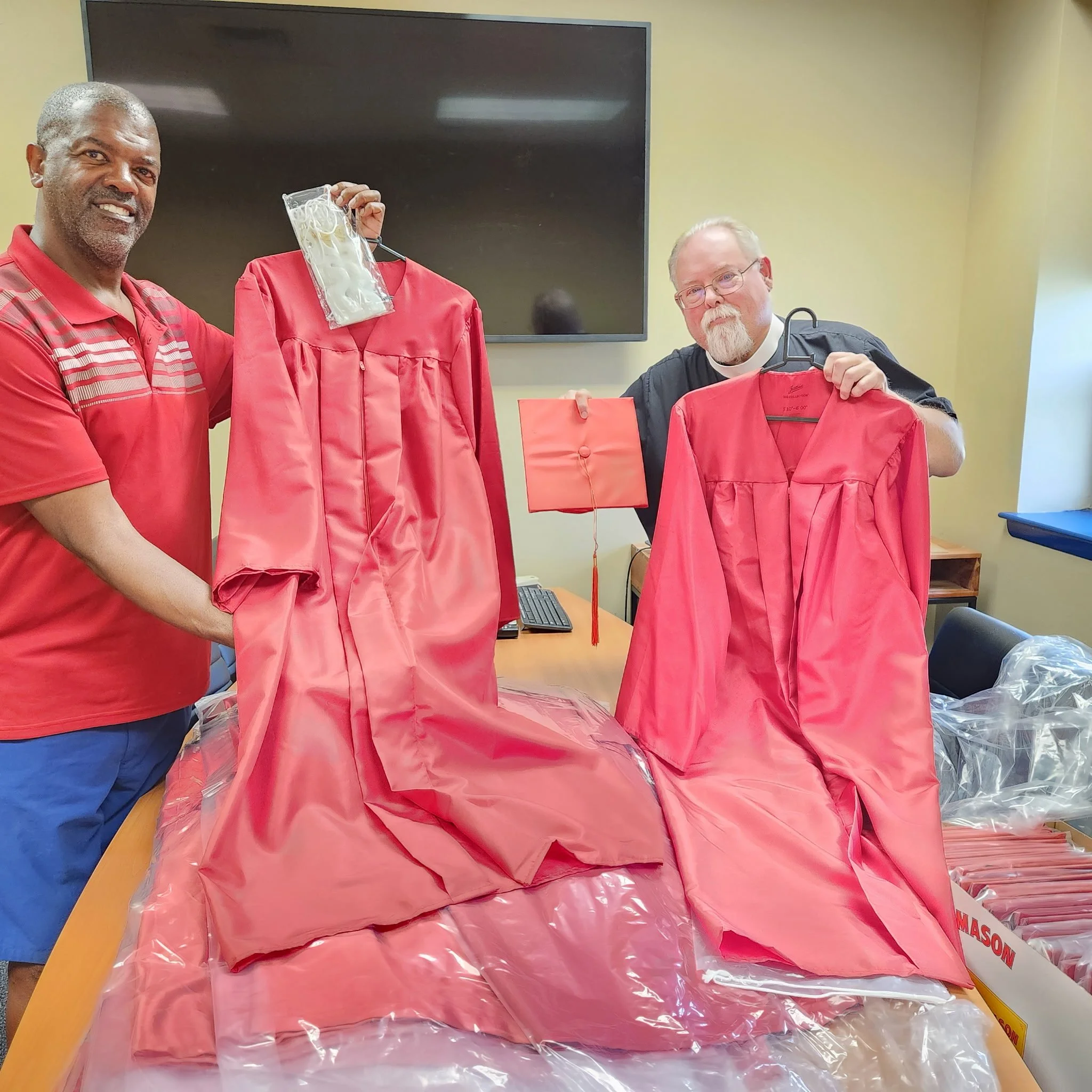 Cliff Brock and Deacon Joe German with the 29 caps and gowns donated to the George W. Hill Correctional facility.